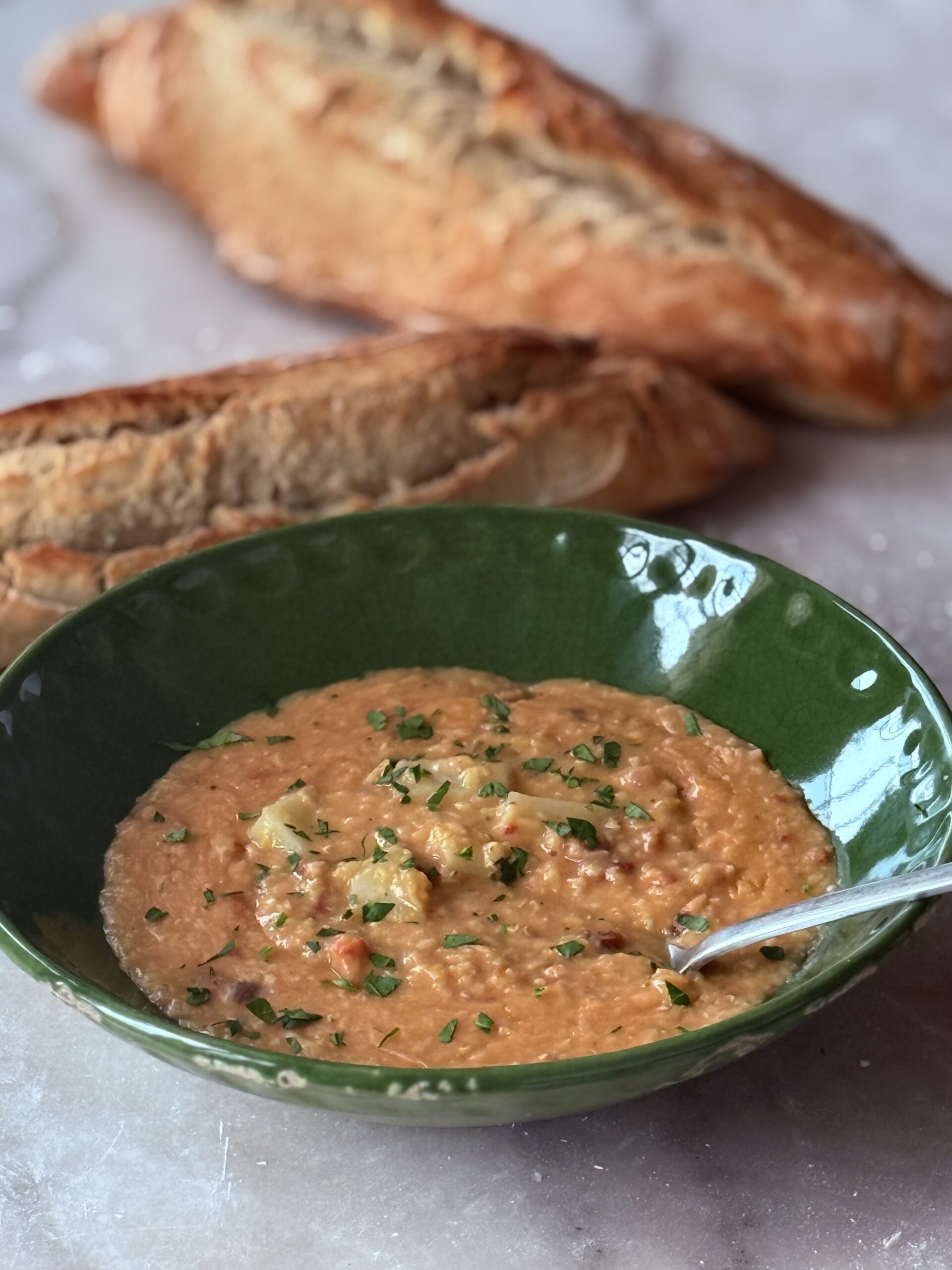 And then I followed my usual method for making a creamy soup: Sauté aromatics; make a roux; add the liquid and the main ingredients. Let it simmer on the stove until done.